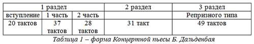 Обращаясь к анализу «Концертной пьесы» Б. Дальденбая, отметим ее макроформу как сложную трехчастную с развернутым вступлением и репризно-варьированным завершением. При этом первый крупный раздел организован как простая двухчастная форма – характерный прием для раннего этапа композиторского становления, когда осваиваются базовые модели формообразования и выстраивается собственный интонационный словарь. Структурную схему можно представить в Таблице №1. Такая архитектура задает ясный драматургический рельеф: энергичное экспозиционное высказывание, контрастный средний раздел и возвращение исходного материала с элементами обновления фактуры и кульминационного наращения.