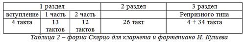 Скерцо И. Кулиева в сопоставлении с произведением Б. Дальденбай обнаруживает общность формообразовательной логики. Макроархитектура – сложная трехчастная форма с развернутым вступлением и репризным замыканием (таблица 2); при этом первый крупный раздел организован как простая двухчастная форма, где вторая часть «вырастает» из материала первой, функционируя как дополняюще-ответный пласт. Средний раздел контрастен, хотя контраст выражен менее резко, чем у Б. Дальденбай: он смещает ладотональную опору и «смягчает» пульсацию, не разрушая общей моторики. Заключительный раздел представляет собой вариантную репризу с уточнением акцентно-ритмического рисунка и фактурным уплотнением.